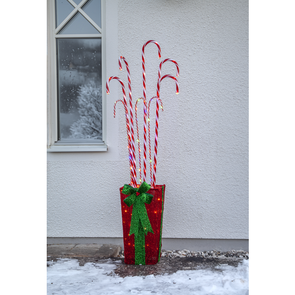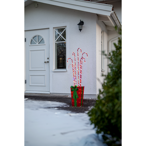 Coole, etwas größere Weihnachtsdekoration für den Außenbereich, die am besten in einer geschützten Umgebung, z.B. unter einem Dach, aufgestellt wird. 1500mm hoch mit mehrfarbigen Lichtpunkten. 10 der Lichtpunkte haben einen Blinkeffekt. Schafft einen Blickfang und sorgt für eine schöne Atmosphäre. Erdspieße und Kabelbinder für eine einfache Montage und Befestigung sind im Lieferumfang enthalten.