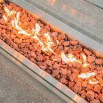 Mitte der Feuerstelle eingearbeitete Brenneinheit weist eine rechteckige und schmale Kontur auf. Dekoriert mit den rötlichen Lavasteinen