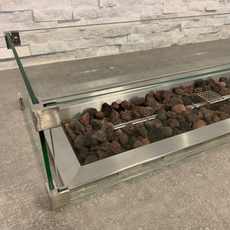 Um die Brennereinheit herum bietet der Granville Gartenkamin breite Ablagefläche für Getränke und Snacks. Mit dem vorhandenen Gas-Regler