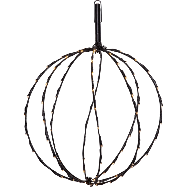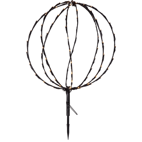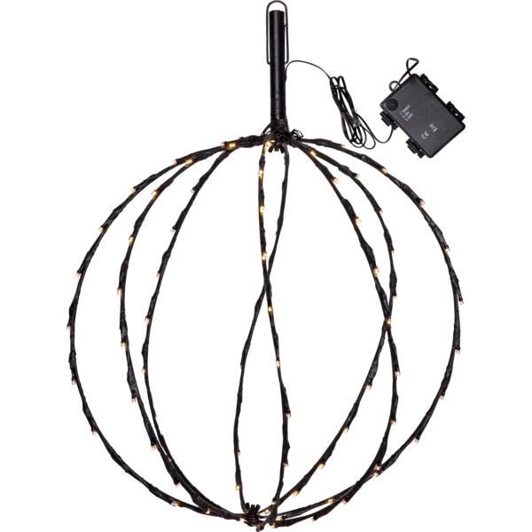 Dekorative schwarze Kugel mit 88 warmweißen Lichtpunkten, 400mm im Durchmesser. Gibt eine wunderschöne Beleuchtung für Ihren Garten. Das Produkt kann sowohl hängend als auch stehend verwendet werden, der Erdspieß ist abnehmbar und es gibt einen Haken zum Aufhängen, um das Kabel nicht zu belasten, verwenden Sie eine Kette oder ein Seil, um die Kugel aufzuhängen. Batteriekasten für den Außenbereich. Die Kugel ist faltbar, was bei Nichtgebrauch Platz spart.
